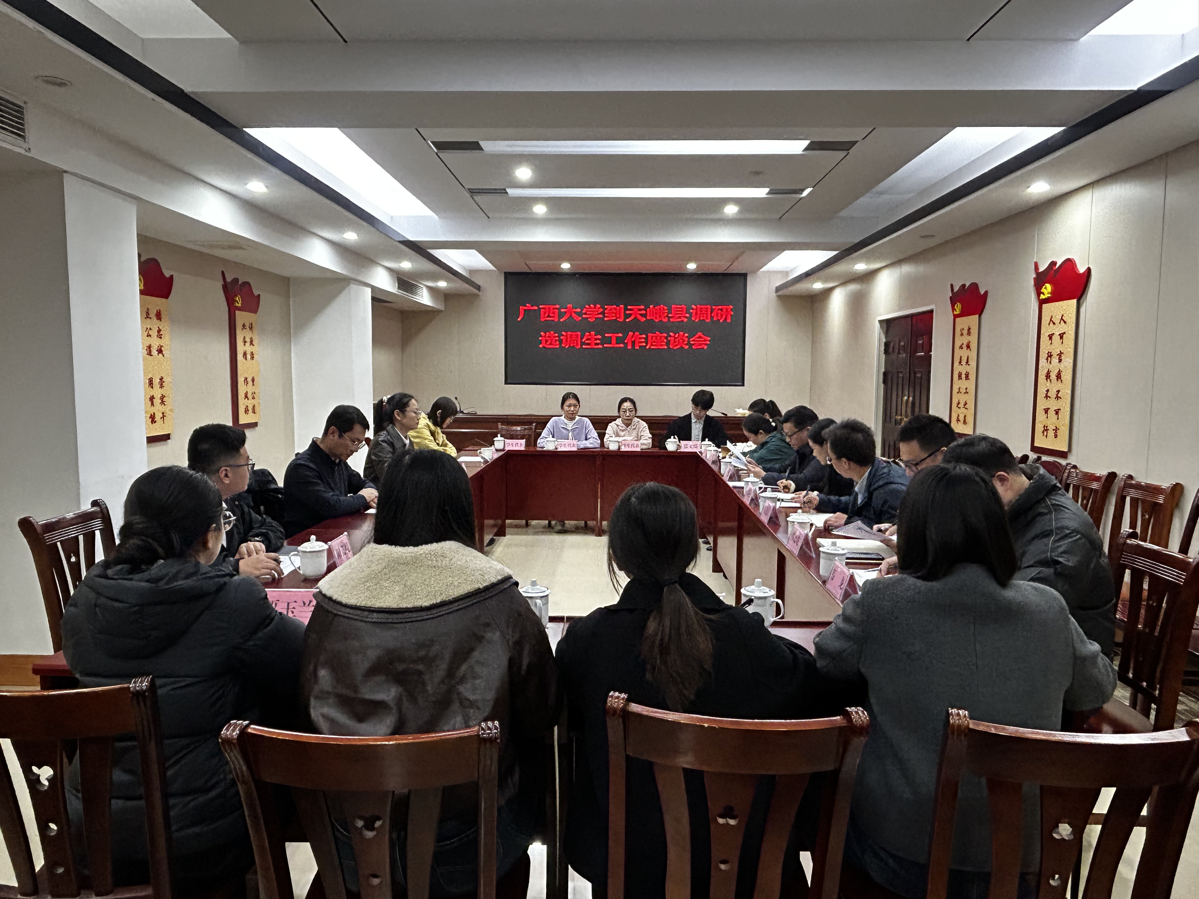 为贯彻落实学校党委关于选调生工作的决策部署,受学校党委委派,近日,我院党委副书记孙晓黎带队前往河池市天峨县走访调研选调生工作。天峨县委常委、组织部部长卢仁国及有关负责同志参加座谈交流。