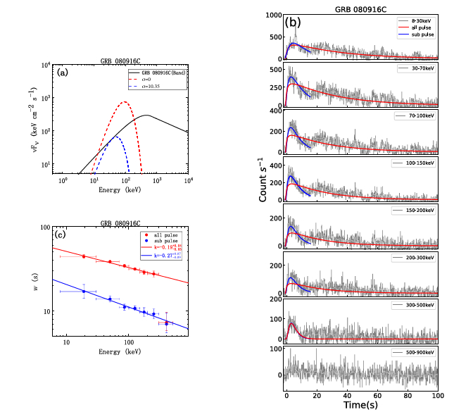 图2. GRB 080916C 的光谱和时间分析。(a) 光球层光谱的预测下限(虚线,假设R0=1010cm)与观测到的非热辐射谱(实线)。(b) GRB 080916C瞬时辐射在不同能量范围内的光变曲线(灰色),以及FRED模型拟合结果(红色实线)。(c) 全局脉冲和子脉冲通过FRED模型拟合得到的脉冲宽度(w)随能量的变化关系,以及幂律拟合结果(红色和蓝色实线)。